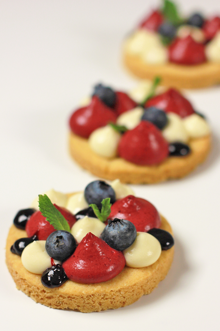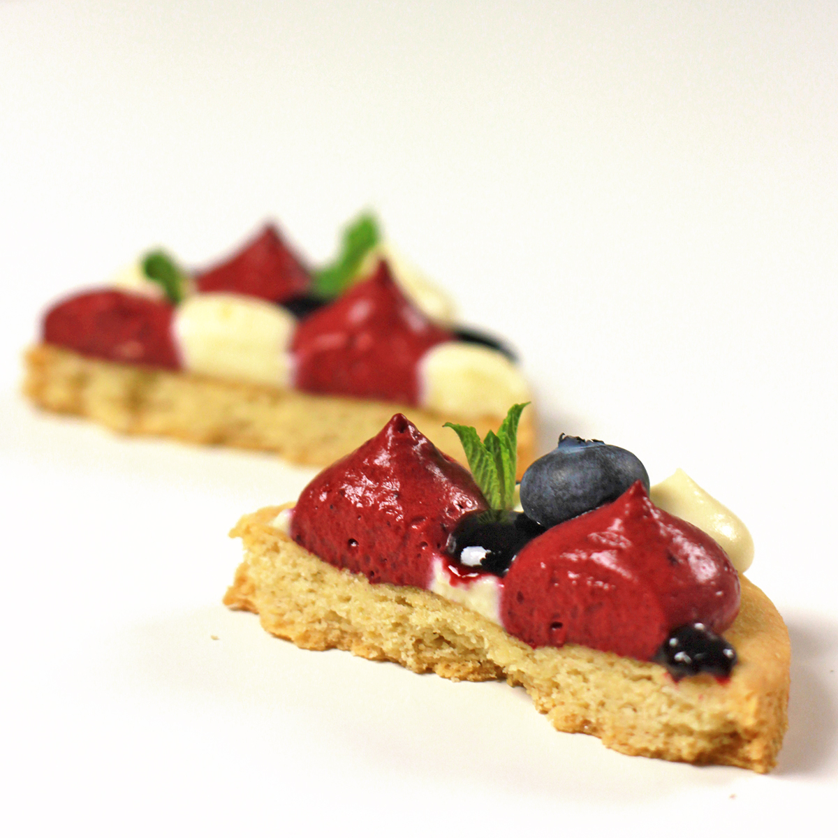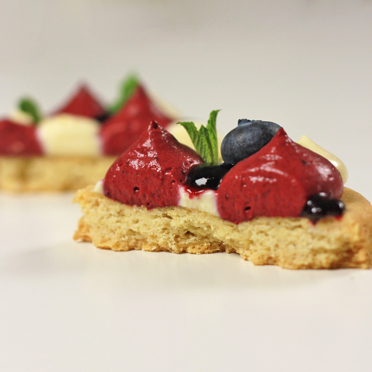 Šī vienkārši pagatavojamā, bet garšas pilna tarte ir radīta savienojot klasiku ar mūsdienīgu skatienu. Šī recepte ir lieliski piemērota tiem, kas vēlas pagatavot cita veida taršu pamatni bez papildu sarežģītības. Bretaņas smilšu mīkla izceļas no biežāk sastopamajām sucre, sablé un brisée, ar krēmīgu, drupanu tekstūru un smalku sāls piegaršu. Šī tarte ir pildīta ar diviem Diplomat krēmiem, tie piešķir tai brīnišķīgu vizuālo un garšas kontrastu: pirmā ir klasiska un krēmīga, bet otrā ir svaiga ar košu melleņu un upeņu garšu. Džems ar izteiktu skābumiņu, kas ir pagatavots no tām pašām ogām, piešķir bagātīgam krēmam atsvaidzinošu noti un līdzsvaro garšas. Svaigas mellenes un svaigu piparmētru lapiņas dekorācijā iedod tartei pēdējo vienkāršības un elegances pieskārienu.