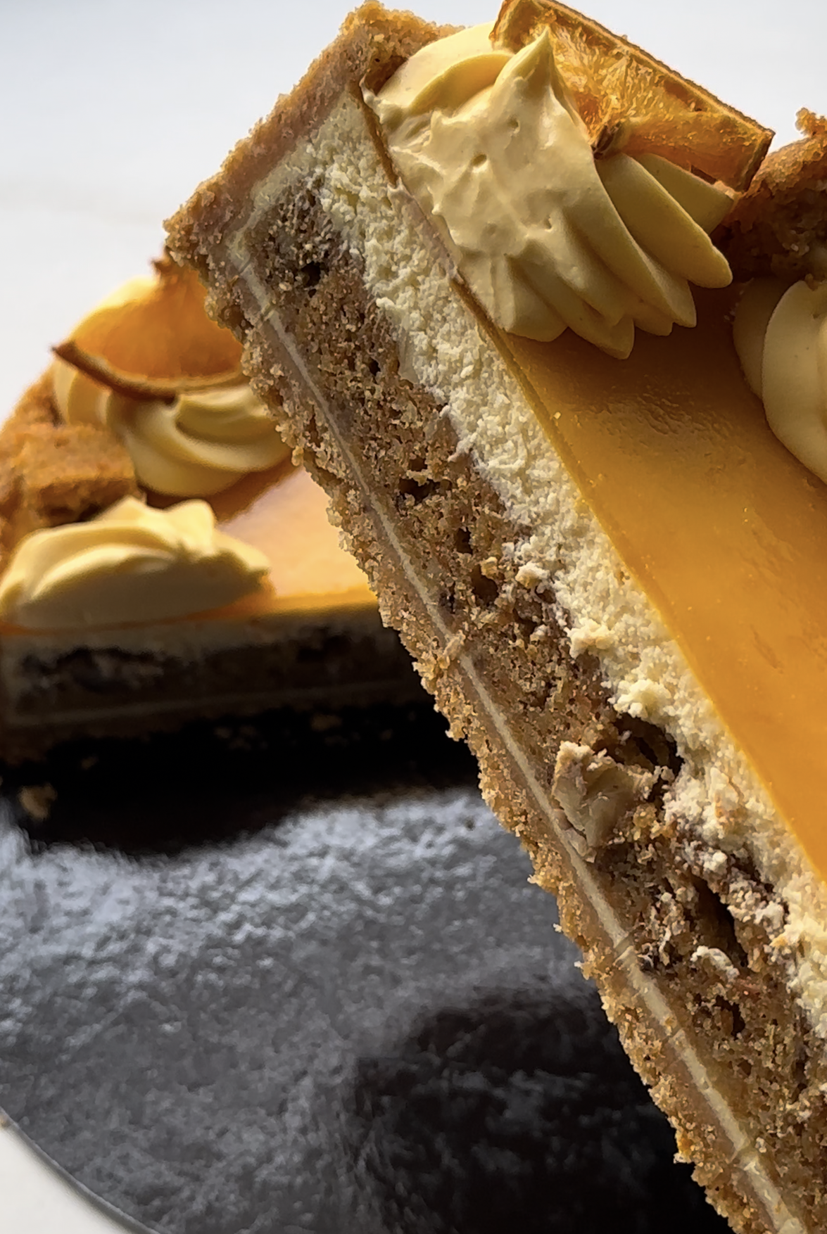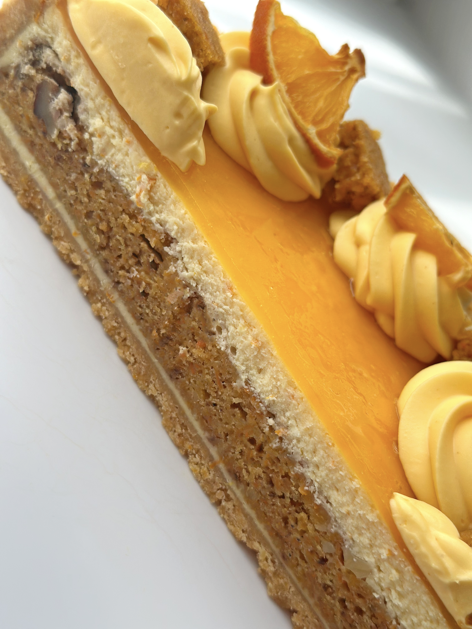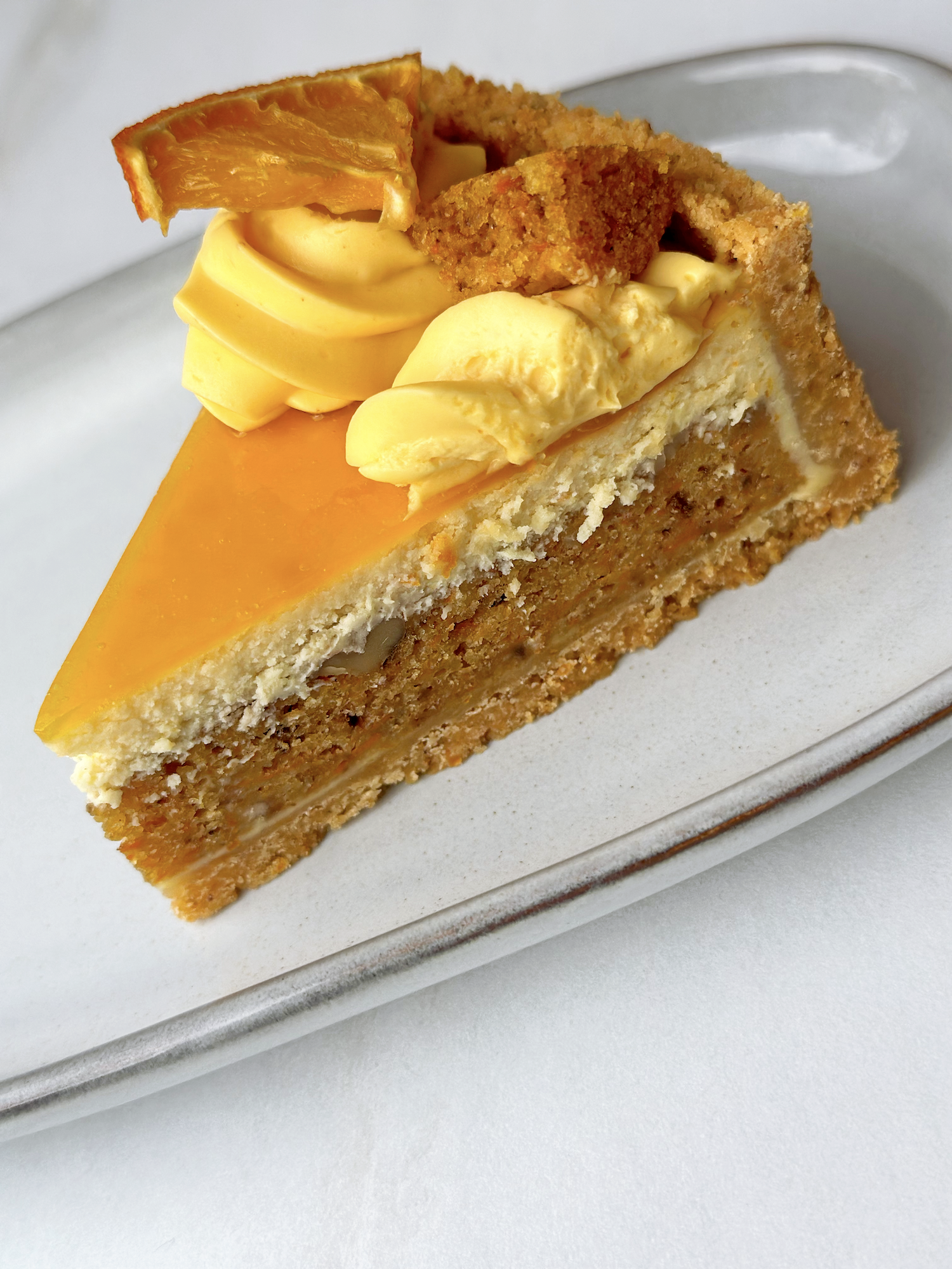 Kas notiktu, ja divi ikoniski deserti apvienotos vienā un vēl ar modernu odziņu? Tas nav tikai divu iemīļotu desertu apvienojums, bet mājīgā garša ar jaunu, izteiksmīgu garšu spēli un pārsteidzošu smiltsērkšķu akcentu. Viss sākas ar kraukšķīgu, drupanu burkānu cepumu pamatni. Tad nāk gaisīgais burkānu biskvīts ar vieglu garšvielu niansi un valriekstu gabaliņiem, kas piešķir patīkamu tekstūru un siltu garšu. Kompozīcijas centrā ir Ņujorkas stila siera kūka, kur maigu krēmveida saldumu līdzsvaro citrusaugļu skābenā nots. Noslēdzošais akcents — plāna apelsīnu marmelādes kārtiņa, kas piešķir svaigumu, un virspusē — maigs smiltsērkšķu ganašs, kas harmoniski savieno visas garšas. Katra šī deserta detaļa ir radīta no nulles: gan burkānu cepumi, gan marmelāde, pat žāvētas apelsīna šķēlītes dekoram. Bez kompromisiem — tikai mīlestība pret detaļām un nedaudz kulinārās maģijas.