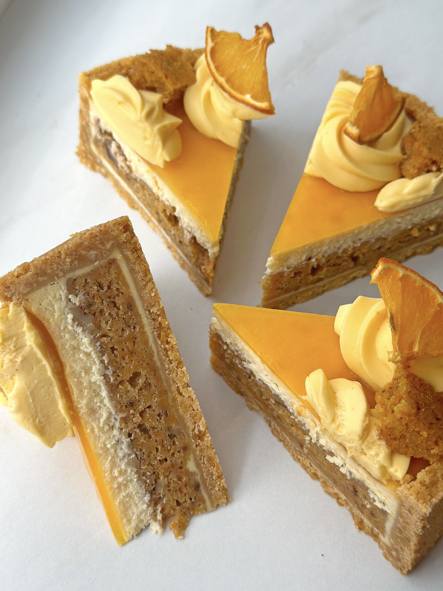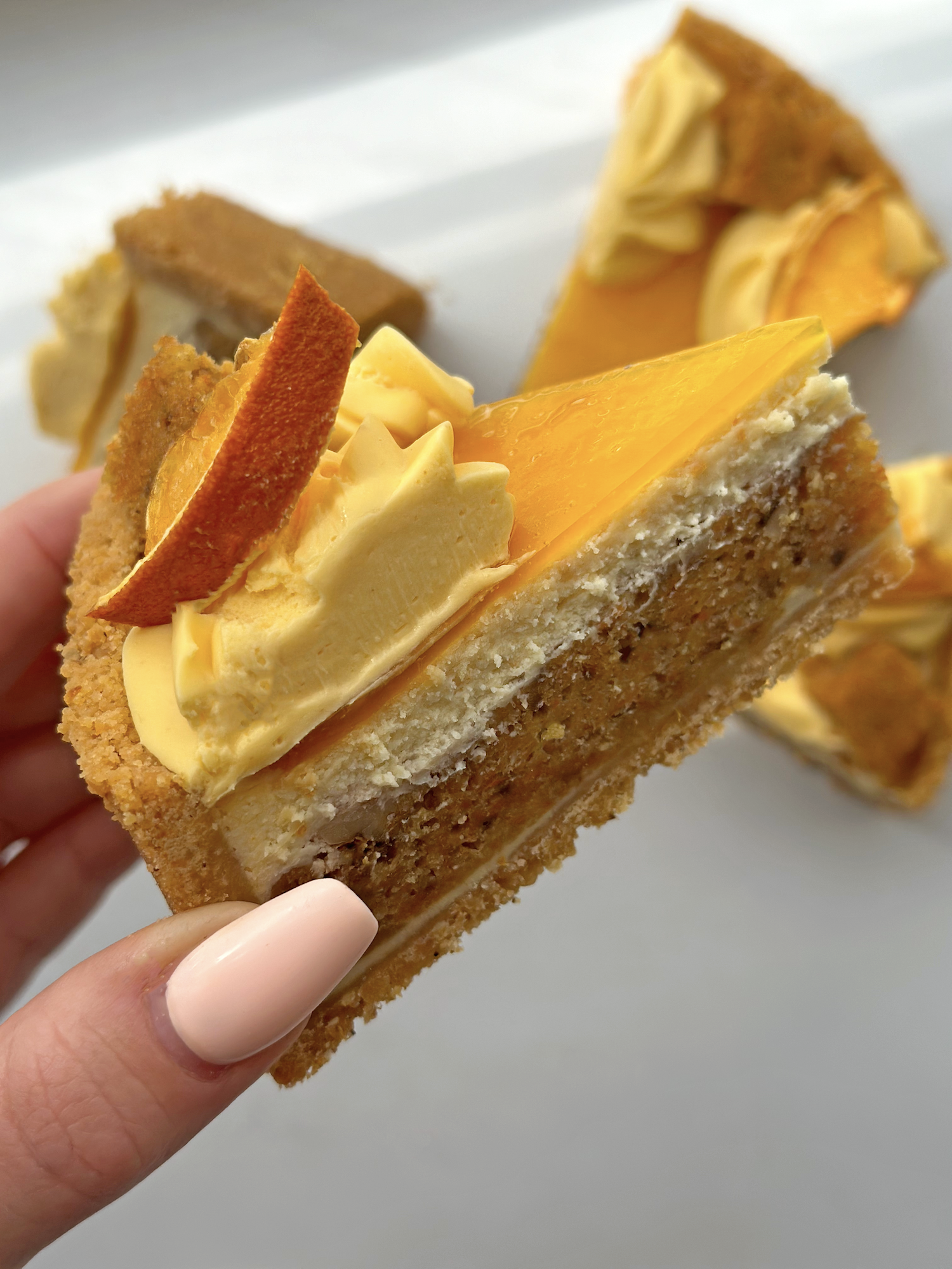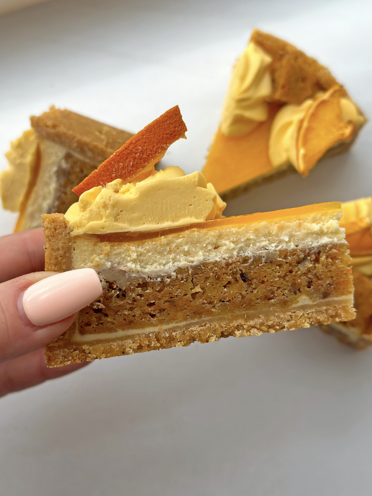 Kas notiktu, ja divi ikoniski deserti apvienotos vienā un vēl ar modernu odziņu? Tas nav tikai divu iemīļotu desertu apvienojums, bet mājīgā garša ar jaunu, izteiksmīgu garšu spēli un pārsteidzošu smiltsērkšķu akcentu. Viss sākas ar kraukšķīgu, drupanu burkānu cepumu pamatni. Tad nāk gaisīgais burkānu biskvīts ar vieglu garšvielu niansi un valriekstu gabaliņiem, kas piešķir patīkamu tekstūru un siltu garšu. Kompozīcijas centrā ir Ņujorkas stila siera kūka, kur maigu krēmveida saldumu līdzsvaro citrusaugļu skābenā nots. Noslēdzošais akcents — plāna apelsīnu marmelādes kārtiņa, kas piešķir svaigumu, un virspusē — maigs smiltsērkšķu ganašs, kas harmoniski savieno visas garšas. Katra šī deserta detaļa ir radīta no nulles: gan burkānu cepumi, gan marmelāde, pat žāvētas apelsīna šķēlītes dekoram. Bez kompromisiem — tikai mīlestība pret detaļām un nedaudz kulinārās maģijas.